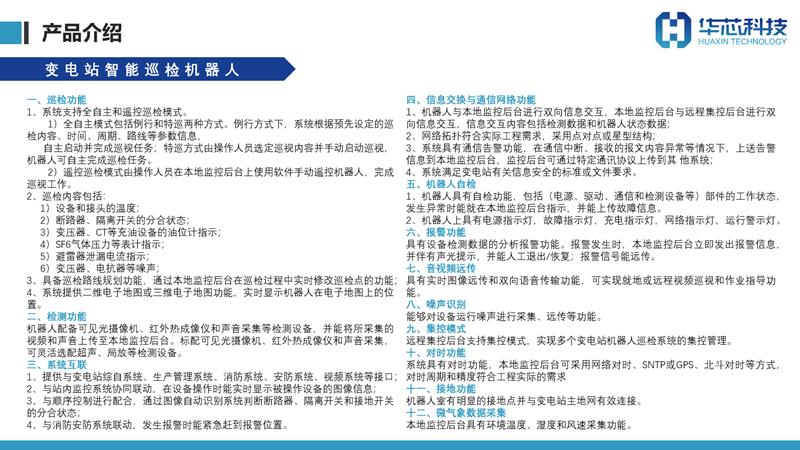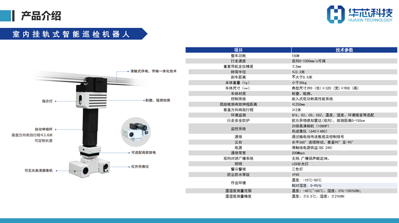 室内导轨型智能巡检机器人系统实现开关柜红外测温、局放检测、柜面及保护装置信号状态指示等的全自动识别,继保室保护屏柜压板状态、空开位置、电流端子状态、装置信号灯指示以及数显仪表的全自动识别读数。系统采用导轨滑触式供电方式,实现24小时不间断巡视,也可自定义周期和设备进行特殊巡视。
