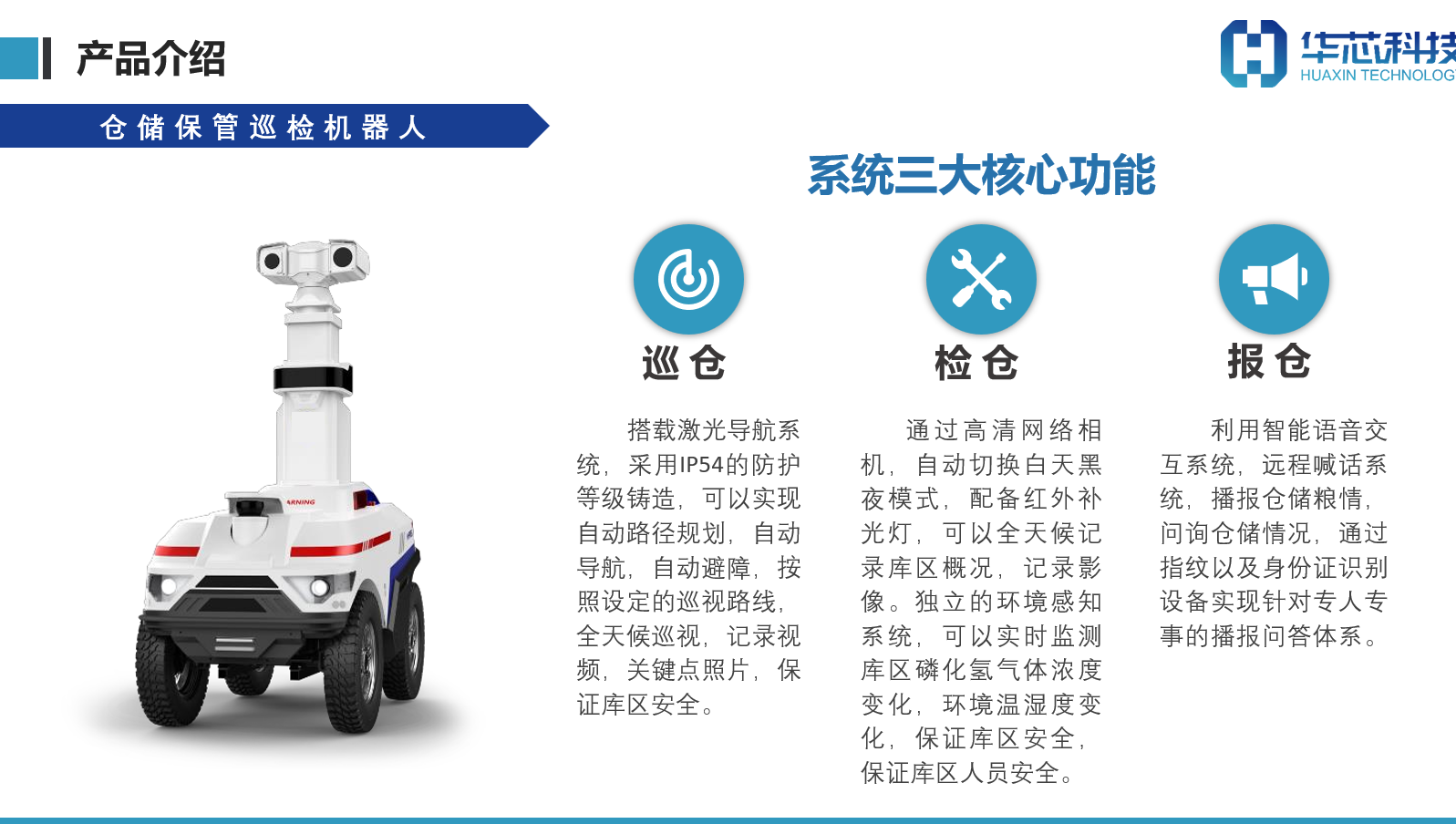 仓储保管巡检机器人是一种综合利用物联网、人工智能、云计算、图像处理、大数据等技术,集成环境感知、动态决策、行为控制、和报警装置,具备自主感知、自主行走、自主保护、互动语音交流的能力。可以与第三方数据平台对接进行粮情数据交互,可以动态化的展示仓储粮情数据,可以定时盘点所有仓间安全仓储状态的可移动化智能数据终端 。